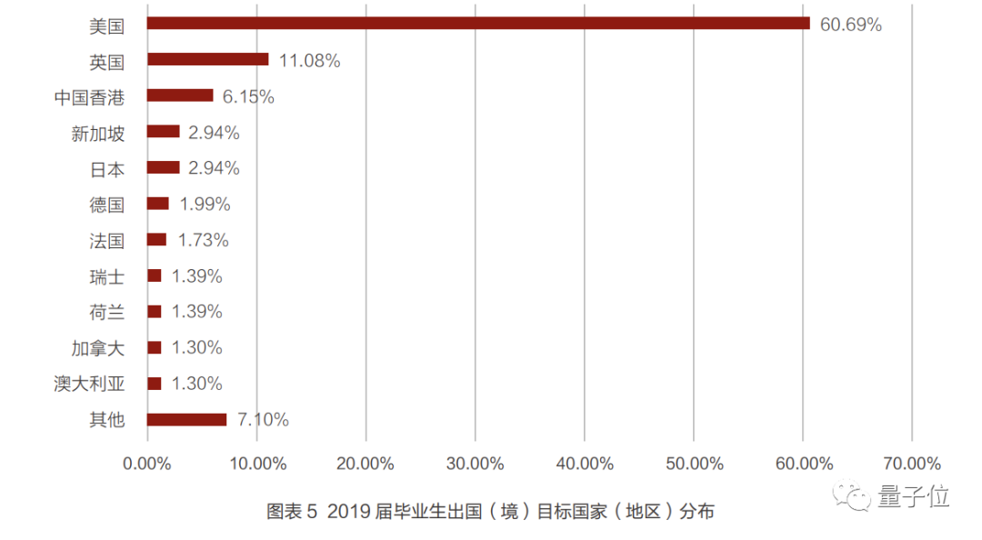 从学校和地区角度来看,留学的清北毕业生,首选毫无意外的是美国,占到5年间出国总人数的70%。