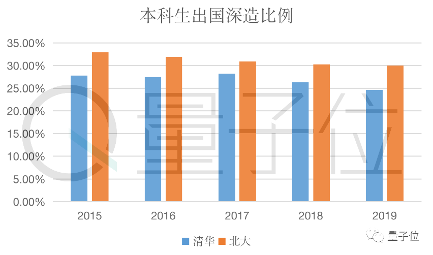2015-2019年,清华、北大毕业生每年出国(境)深造人数平均为1052人、1168人,在两校毕业生中占比均在16%左右。