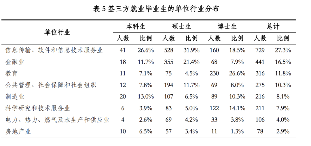 2019 年,在北大所有签订三方协议就业的毕业生中,83.13% 的毕业生签约就业集中在教育、金融业、公共管理、 信息传输、科学研究和技术服务等行业。