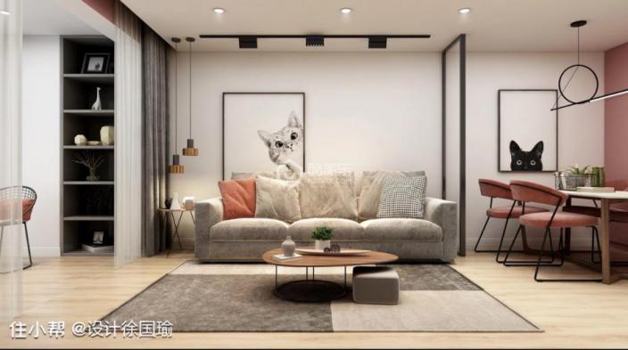 虽然是小户型装修效果,但是“麻雀虽小五脏俱全”。我们接下来看看餐厅的效果图,餐厅大胆运用了桃粉色,典雅别致的餐椅搭配白色防大理石材质的餐桌,桃粉色储物柜与餐椅子相呼应,清新跳脱的治愈系居住空间就呈现出来。餐厅黑色圆环吊灯使得整体画面内容与空间更加契合,猫咪简笔画的加入瞬间提升了整个空间的质感。