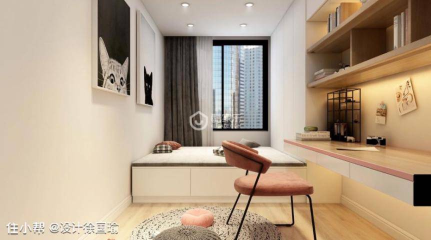 次卧是一间书房,飘窗榻榻米的设计置换了传统的家具沙发和椅子,不仅帮Jenny节省了预算,还合理的利用了空间。原木色宽敞书桌在设计上运用了桃粉色与公寓主打色调相互吻合,猫咪简笔画使得整个空间更具有趣味性。