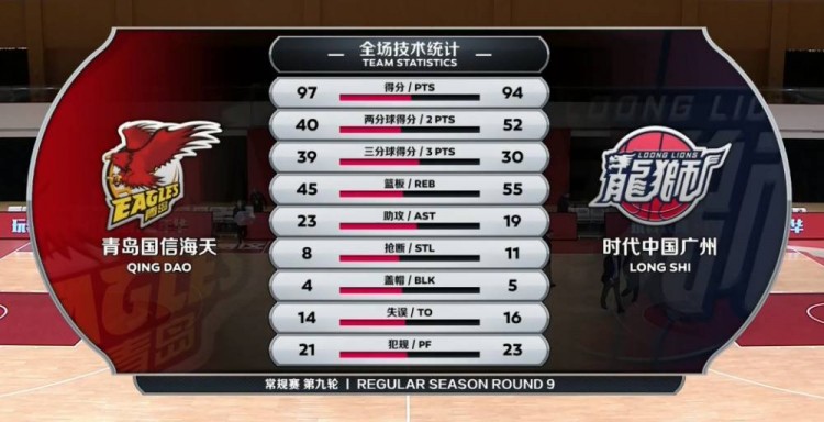 青岛(6-3):亚当斯31分7篮板9助攻4抢断,王庆明23分10篮板,杨金蒙10分2抢断,邵英伦6分4篮板,张骋宇7分3篮板2助攻,赵泰隆5分6篮板2助攻,斯蒂马克5分。
