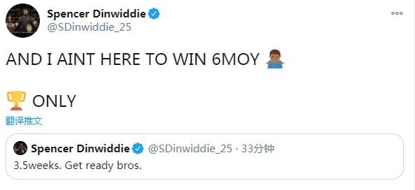 篮网球员丁威迪也在之后发文表示:“还有三周半,准备好兄弟们。我不是来这争夺最佳第六人的,(目标)只有冠军。”