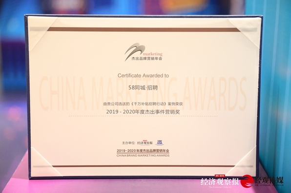 近日,由经济观察报、经观传媒主办,中国广告协会指导的“2020年杰出品牌营销奖颁奖典礼”在上海举行。经过4个月的评选,58同城招聘以“千万补贴招聘行动”,荣获经济观察报2019-2020年度杰出事件营销奖,获得业界高度肯定。58同城“千万补贴招聘行动”通过线上线下百场活动促招工、稳就业,并精准助力商业转化。