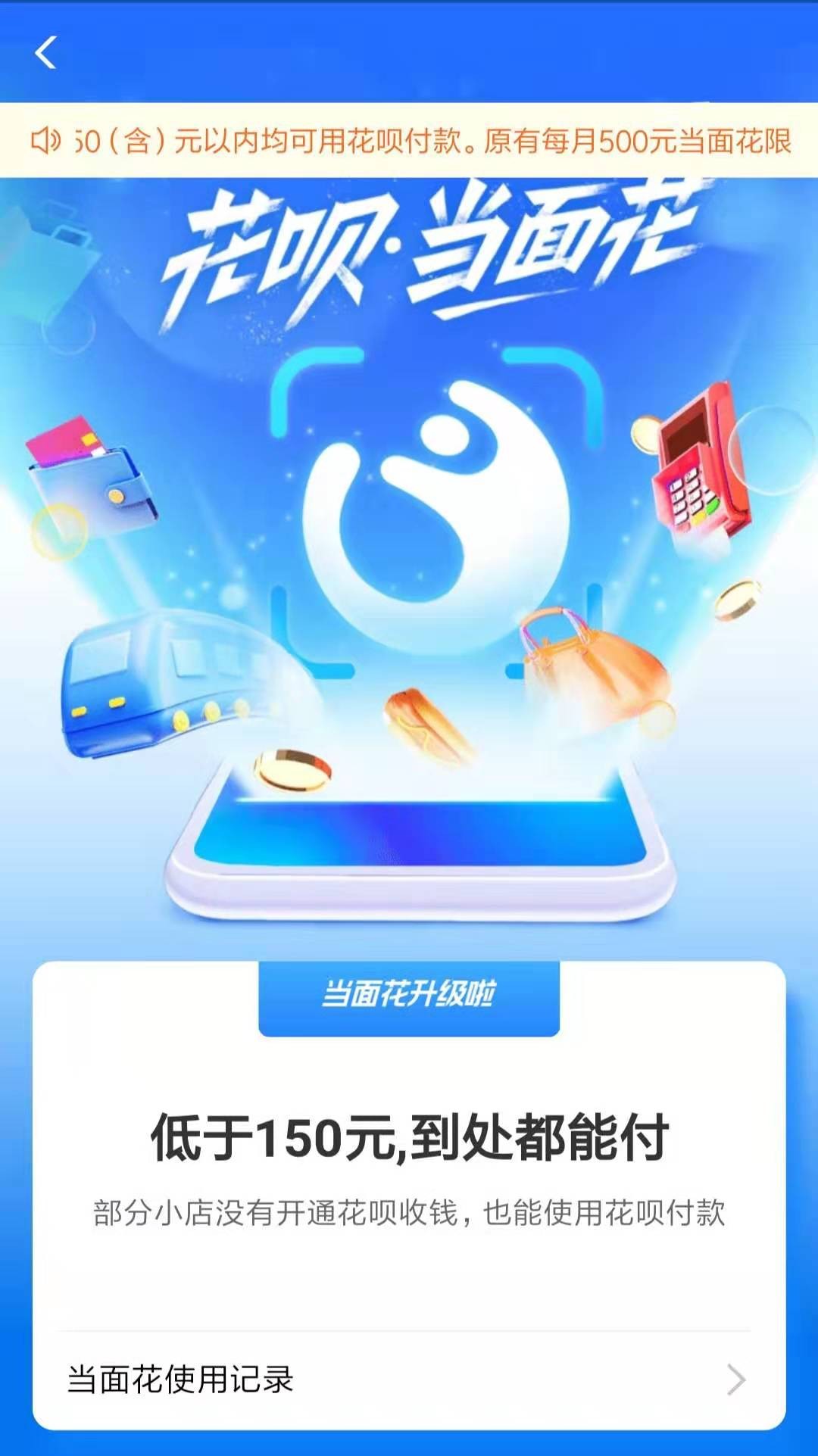 从9月1日起,支付宝宣布“当面花”功能升级。符合“当面花”场景的实体店交易,单笔订单金额在150(含)元以内均可用花呗付款。取消原来每月500元“当面花”限额,积分兑换当面花的功能亦同步下线。