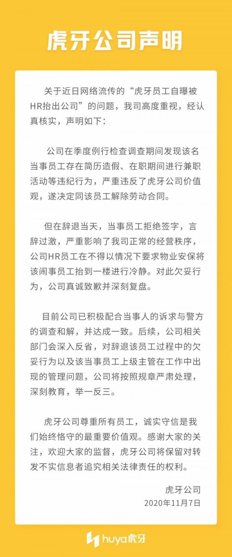 虎牙回应员工称被 HR 抬出公司:行为欠妥,深入反省