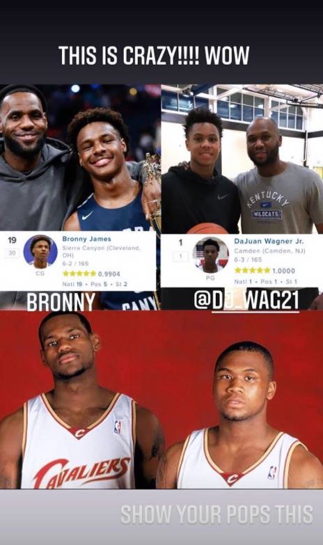 11月9日讯 湖人球员詹姆斯今日更新个人社交媒体,晒出一张布朗尼与前队友瓦格纳的儿子在2023级高中生的排名对比图,同时表示:“这太疯狂了!!!哇!”