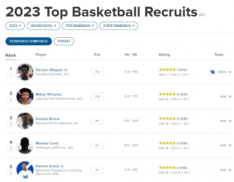 该排名是来自于知名选秀网站247sports,瓦格纳儿子小瓦格纳高居榜首,布朗尼则是位列第19位。