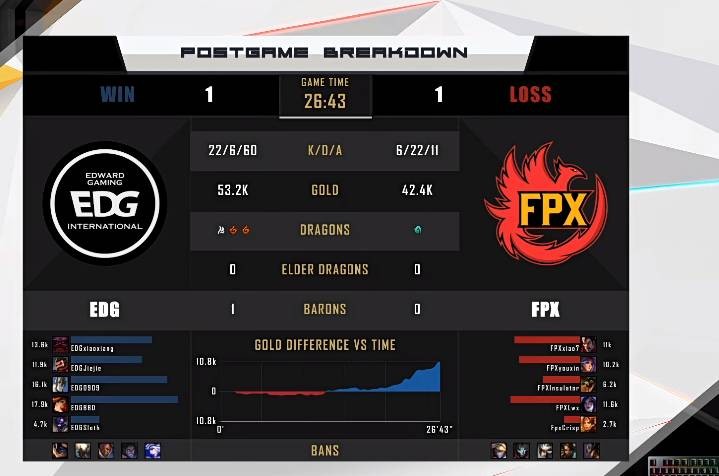 【24:55】EDG逼上FPX的高地,凭借经济优势和装备压制成功击败FPX拿下本场比赛胜利,双方1比1平手。