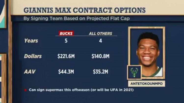 据此前报道,字母哥可以与雄鹿续约一份五年,总薪资高达2.2亿美元的超级顶薪合同,而其他球队最多只能给他四年1.4亿美元的合同。