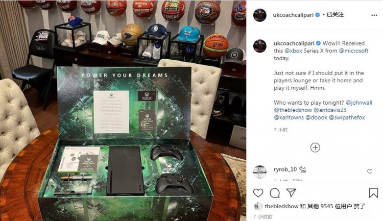 11月10日讯 NCAA名帅、肯塔基大学主帅卡利帕里今日晒出了他的次世代游戏主机Xbox Series X(今日刚发售),同时还发文向浓眉、唐斯等几位昔日爱徒询问,是否今晚要来一把游戏。