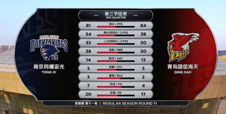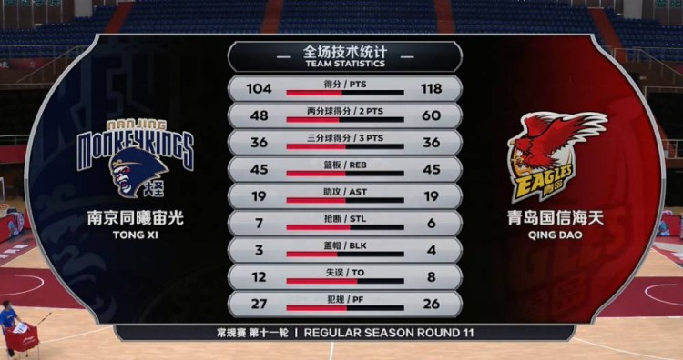 青岛(8-3):亚当斯49分10篮板7助攻3抢断,斯蒂马克10分7篮板2封盖,刘传兴10分5篮板3封盖,邵英伦6分5篮板3助攻,杨金蒙8分5篮板,林韦翰5分3助攻,王睿泽8分3篮板。