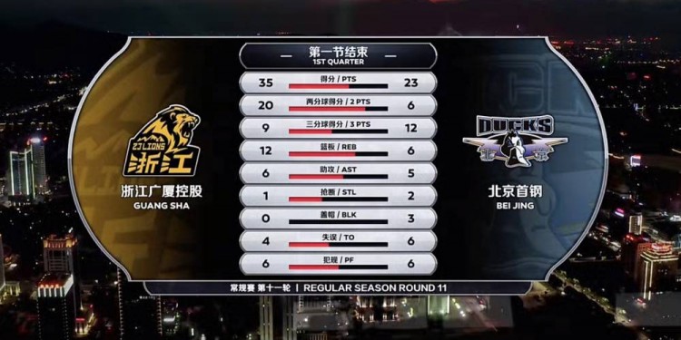广厦(5-4):孙铭徽33分6板13助、胡金秋28分14板2断3帽、拉杜利察23分9板2助、赵岩昊10分6板2助2断、冯欣3分、李金效2分。