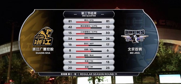 末节上来,范子铭篮下吃饼得手,翟晓川突破上篮将球打进并造成犯规,北京上来一波6-0的攻势取得领先,胡金秋高位投进止血中距离,重新上场的孙铭徽再次造成方硕的违体,汉密尔顿自投自抢补进两分,场上比分交替领先,暂停调整过后方硕突破挑篮得手,随后又杀到篮下打成2+1,个人连得八分,关键时刻赵岩昊罚球故意不中,胡金秋抢到篮板助孙铭徽轰进扳平三分,吉布森命中绝杀中距离,最终北京险胜广厦,结束四连败的同时也终结了后者的三连胜。