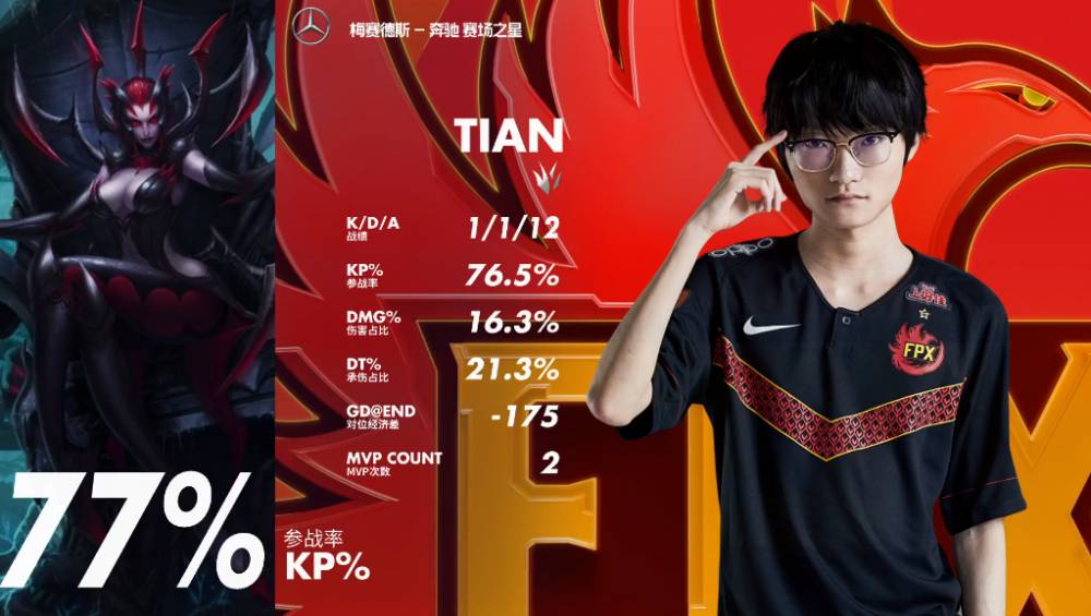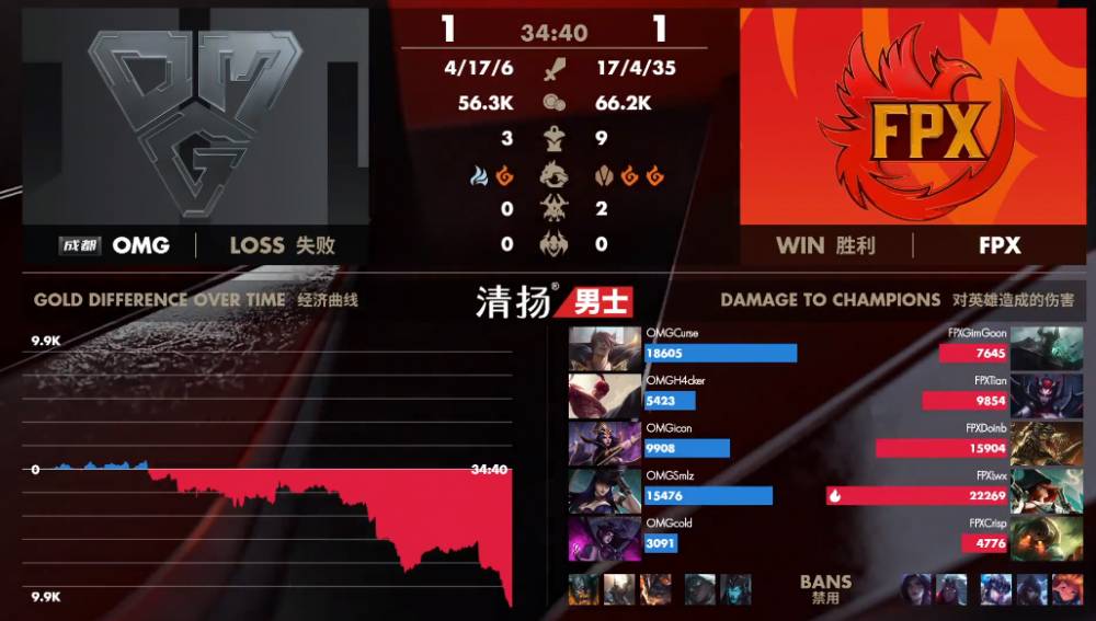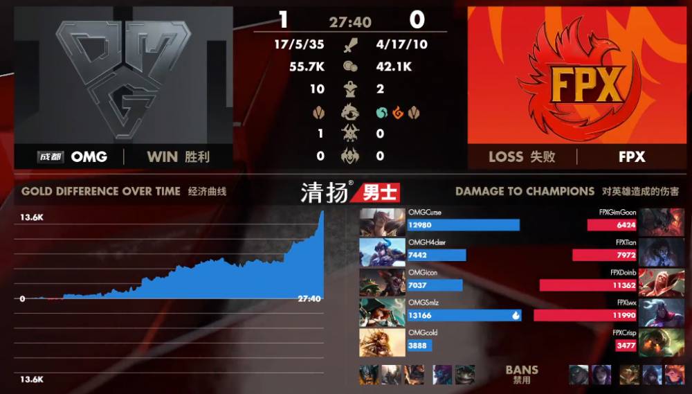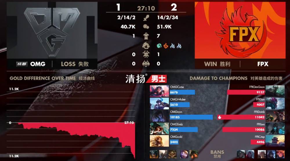 【26:50】下路守塔的剑魔直接被OMG强开,剑魔被击杀后OMG破掉了下路高地,随后在门牙塔前强开,OMG零换五团灭了FPX直接结束了首局比赛。
