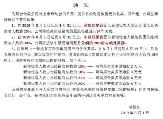 当被问及奇美多为何能上线万注册用户时,裴洪涛称,奇美多前身为一家直销企业,但因为近年直销牌照较难申请,所以转型做社交电商。转型时,公司将原本的老顾客带到了奇美多。当被问及该直销企业名称时,裴洪涛对时间财经表示,“进入公司较晚,不知道该企业名称。”