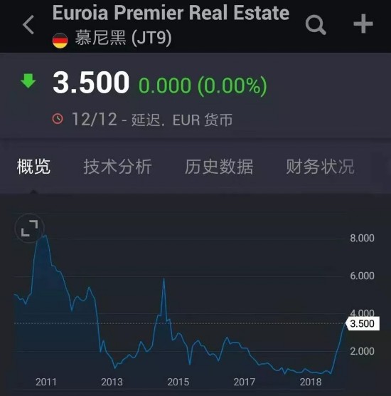 时间财经查阅欧亚第一地产股价情况发现,上市后,欧亚第一地产股价曾有数月上涨,但从2011年起便一路下跌。到今年6月2日收盘,股价仅为0.5欧元。12月3日,即奇美多宣布在慕尼黑上市消息后,欧亚第一地产股价有明显抬升。到12月12日,股价为3.5欧元。