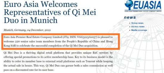 奇美多提供的文件显示,该协议实为欧亚第一地产与奇美多大股东及实际控制人胡权个人之间的协议,而非与奇美多。欧亚第一地产官网信息显示,12月4日,欧亚第一地产提及,对奇美多的收购已经完成。