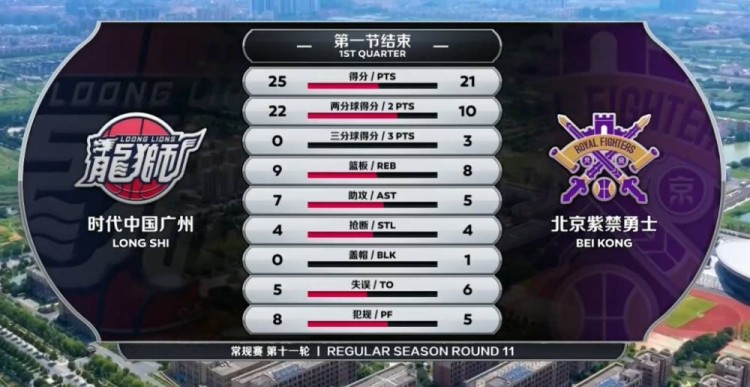 首节开局孙桐林吃饼进球拔得头筹,然而这个吃饼进球是北控开局前3分钟里的全部得分,广州后发制人,在哈斯连拿6分的带领下取得11-2的攻势打停对手。暂停归来又是俞长栋的进球打破得分荒,但又过去接近2分钟后,北控才再一次得分,不过这期间北控也没办法拿分,这也导致分差一直没有拉大开来,北控在这之后由约瑟夫-杨的连投带罚进球很快追上比分,李根的三分则将比分追平。然而北控在这之后又一次陷入莫名得分荒,最后的3分30秒里他们仅得4分,而广州依靠李炎哲最后的连续得分取得4分领先结束第一节。