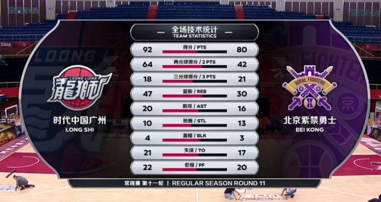 广州(5-6):摩尔25分4篮板3助攻2抢断,郭凯14分11篮板,哈斯10分11篮板,孙鸣阳9分4篮板2助攻,陈盈骏5分3篮板8助攻3抢断,田宇恒7分2助攻,张展玮4分3篮板。