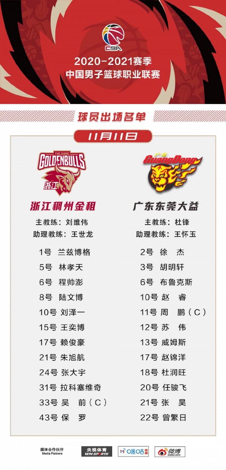直播吧11月11日讯稍后,CBA焦点战广东VS浙江即将开打。赛前出战大名单出炉,双方均全主力出战。(逮虾户)