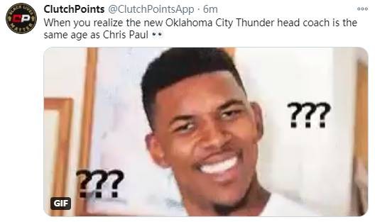 直播吧11月11日讯据名记爆料,马克-戴格诺特被提拔成为球队新任主教练。美媒ClutchPoints发了一张尼克-杨的黑人问号脸调侃说到:“当你意识到雷霆新教练和保罗是同岁时的状态。”(逮虾户)