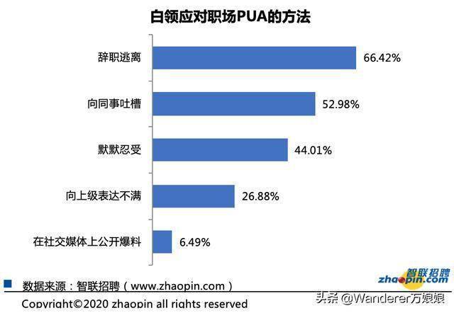 数据显示,职场人应对“PUA”的方法中,选择辞职逃离的人最多,占比达到66.42%;向同事吐槽的比例为52.98%;向上级表达不满的只有26.88%,在媒体上爆料的只有6.49%。