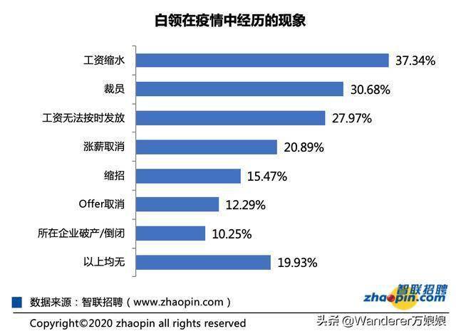 根据智联招聘《2020年白领生活状况调研报告》数据显示,34.74%的受访白领遭遇了工资缩水,30.68%的受访白领在疫情中经受了裁员,仅2成白领得以幸免。