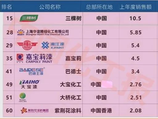 上海华谊精细化工有限公司以销售额5.85亿美元排名第28;湘江涂料以5.39亿美元排第29名;嘉宝莉以4.50亿美元位列第35;巴德士以3.4亿美元列第41;大宝化工以2.76亿美元列第49;大桥化工以2.51亿美元列第51;紫荆花涂料集团以2.08亿美元列第60。
