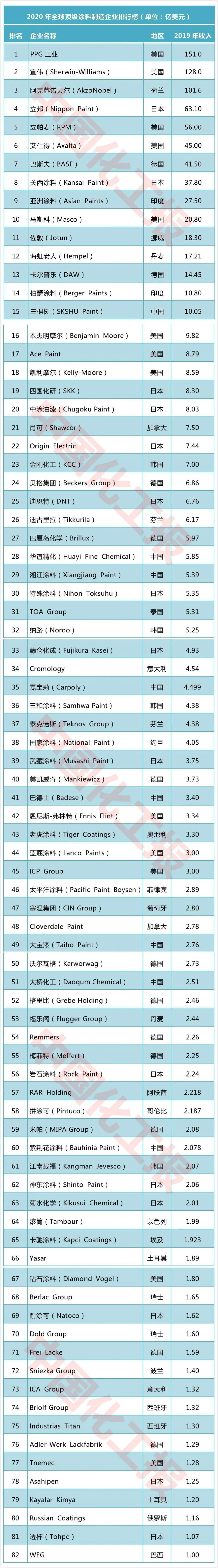 这是《涂料世界》自2010年开始连续第11次发布该榜单。本次上榜共82家公司,入围门槛为2019年销售收入超过在1亿美元。榜单是基于2019财年涂料及其相关业务(粘合剂和密封剂等)年销售收入的排名。
