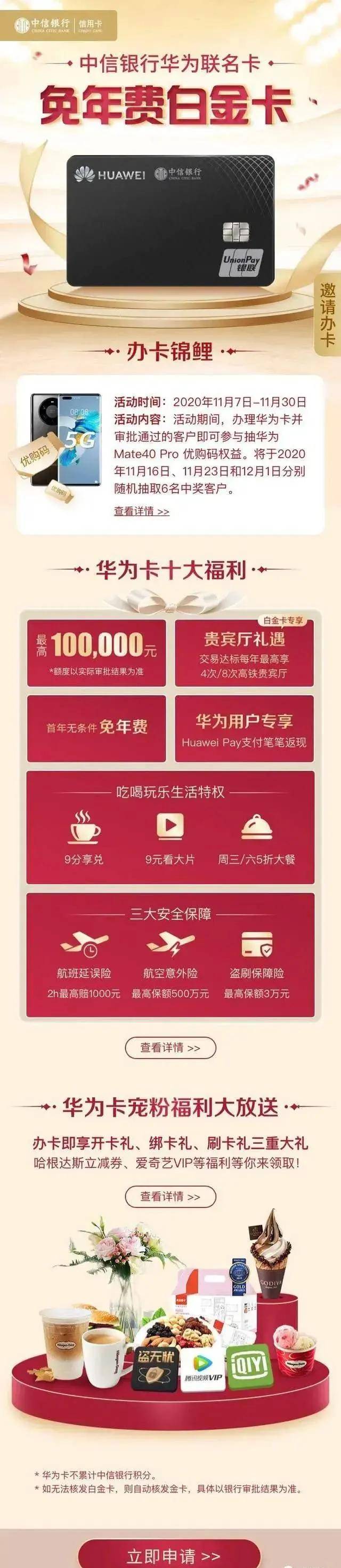 1、该卡是中信银行和华为联合推出的一张白金信用卡,作为首卡申请需谨慎,毕竟是一张白金卡,审核要求比较高,建议大家可以先入手普金卡,需要的小伙伴可于公眾號卡神论咨询申卡细节,7-45天完全没问题。