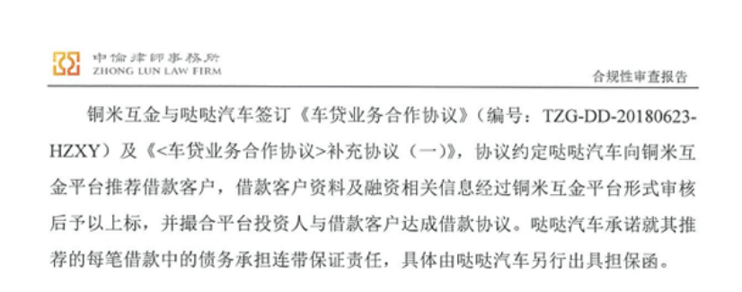 在北京中伦(杭州)律师事务所为其出具的2018年合规性审查报告中,记者看到,铜米互金(即杭州铜米互联网金融服务有限公司)与资产业务合作机构“哒哒汽车”等签订了合作协议。按照协议约定,“哒哒汽车”等向铜米互金平台推荐借款客、借款客户资料及融资相关信息,经过铜米互金平台审核后予以上标,并撮合平台投资人与借款客户达成借款协议。“哒哒汽车”等合作机构承诺就其推荐的每笔借款中的债务承担连带保证责任(如图2所示)。