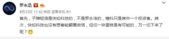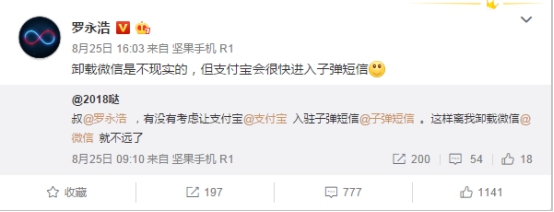 8月25日,罗永浩在微博回应一位网友称,“卸载微信是不现实的,但支付宝会很快进入子弹短信。”
