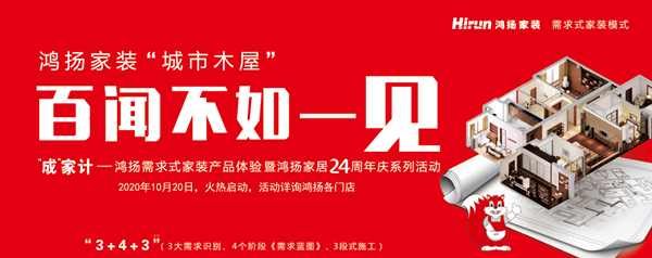 鸿扬家装“城市木屋”“百闻不如一见”“成”家计——鸿扬需求式家装产品体验暨鸿扬家居24周年庆系列活动,火热启动。即日起接受“城市木屋”参观预约,详情请咨询鸿扬家装各门店。