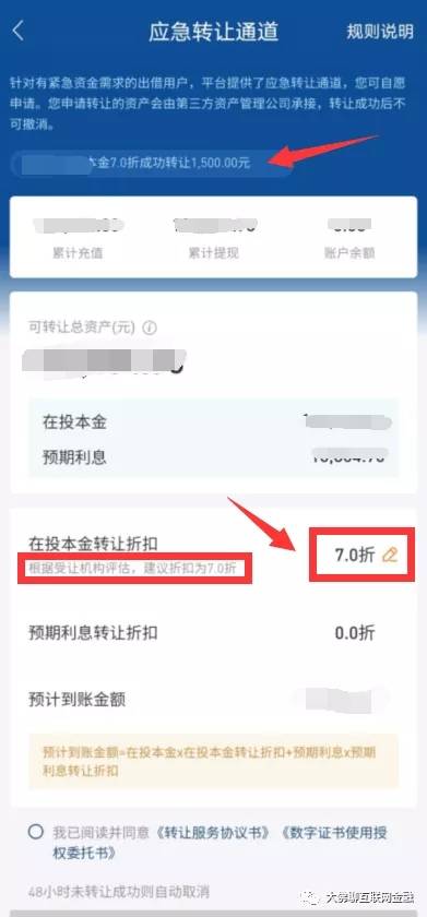 路径是从人人贷的官方APP上登陆,在“我的”账户里进入,就能看到应急通道。折扣通道上提示称:“根据受让机构评估,建议折扣为7.0折”,折扣通过审核后会显示“转让成功”,此后一般要等待2-3天的时间会显示“资金已经到账”。