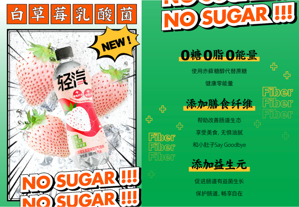 另一个“轻0”系列则有石榴蔓越蔓、青柠西柚、椰子电解质三种口味。在成分上,由于风味水中富含抑制黑色素的烟酰胺、帮助人们缓解压力的春黄菊花提取物、促进蛋白质合成的水解乳清蛋白等,“轻0”更具备双倍抗氧化、舒缓情绪、运动补给等轻功能,是高压青年、学生人群以及运动达人的必备饮品。