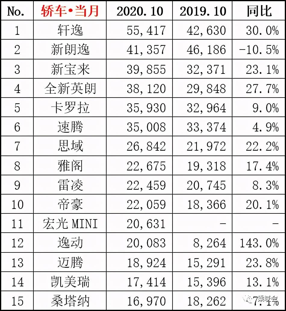 10月轿车销量冠军仍然是轩逸,卖了55417辆,较9月的57438辆有所下滑,但同比仍然高达30%。