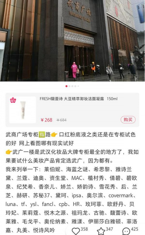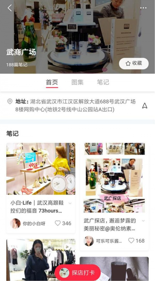 例如武汉武商广场POI页面来说,首页合计展示了12篇笔记,其中就有6篇为化妆品类内容,涵盖包括阿玛尼粉底液、圣罗兰口红等众多奢侈品牌中年轻一代同样热衷的“网红”产品。其中一篇收藏度相对较高的口红粉底试色“安利帖”为例,评论区引发超过两百个用户的热烈讨论。其中既有对商场某专柜的“吐槽”,也有对另一专柜的赞赏,这种极具真实感且生动的互动形式,无疑大大增加了浏览该帖用户的信任感和线下“一探究竟”的兴趣。
