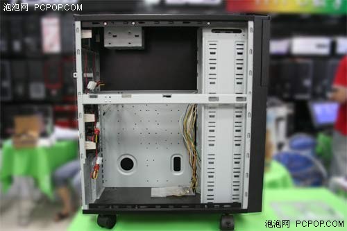 闲线的细节。这款产品通体黝黑,看上去非常敦实。其尺寸为560250650mm(长宽高),仅从这个数据就可以说明S101宽大的空间。由于拥有11个5寸光驱位,S101也可以作为光盘刻录塔的机箱。另外,和9011一样,S101下面还拥有可拆卸的四个滚轮,方便大家移动。对于发烧友来说,就算不移动,四个轮子也可以让自己的电脑与众不同。