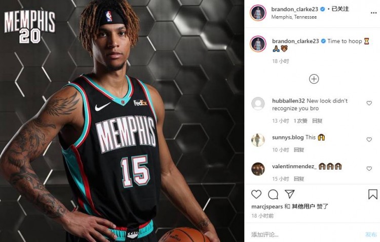 11月13日讯 今日,灰熊球员布兰登-克拉克更新个人Ins晒出了一张自己身穿下赛季城市版球衣的照片并配文说到:“打球时间到⏳