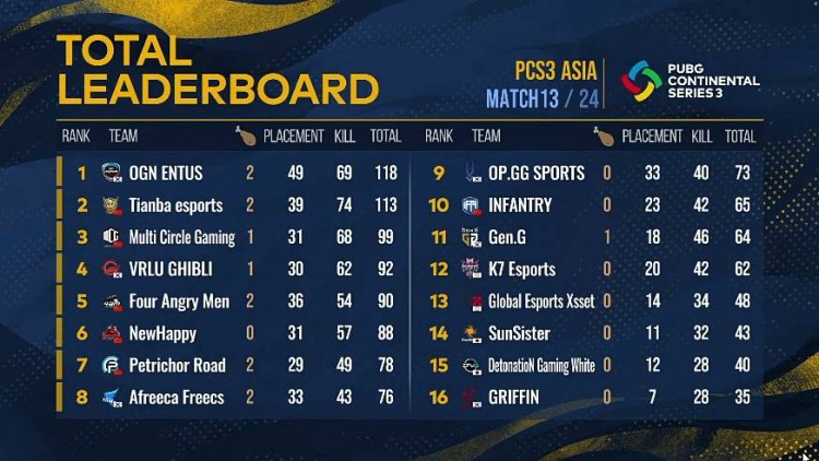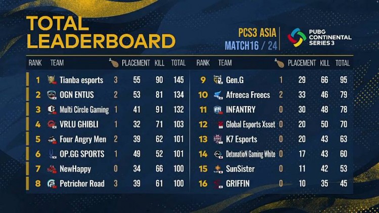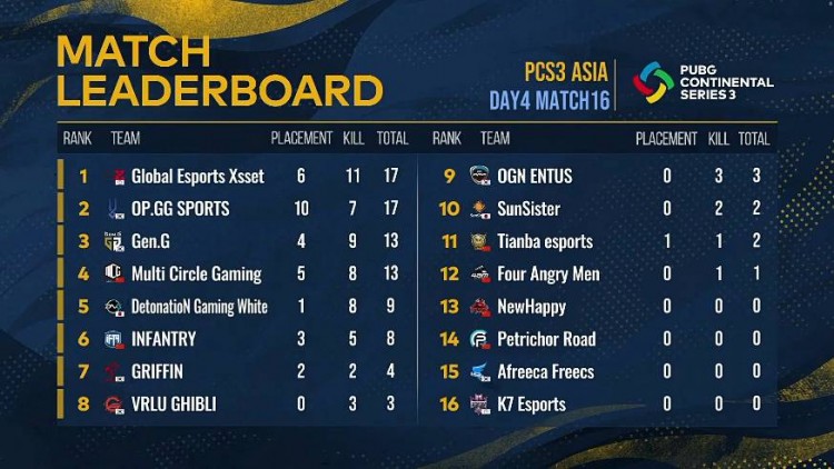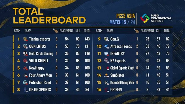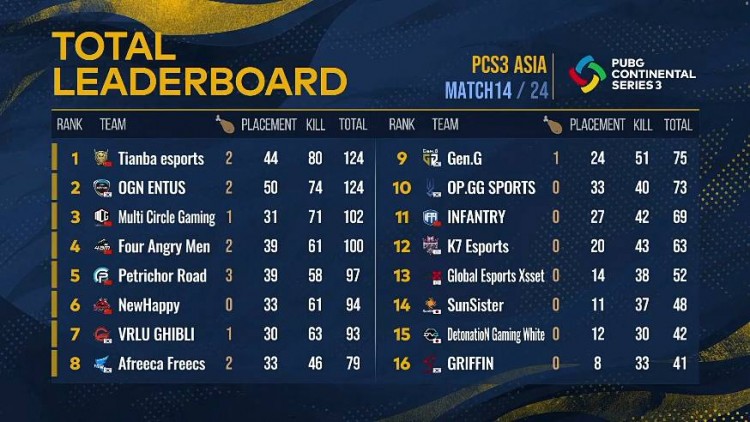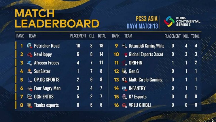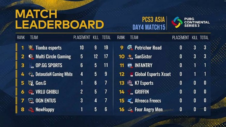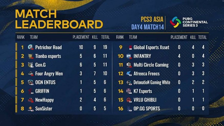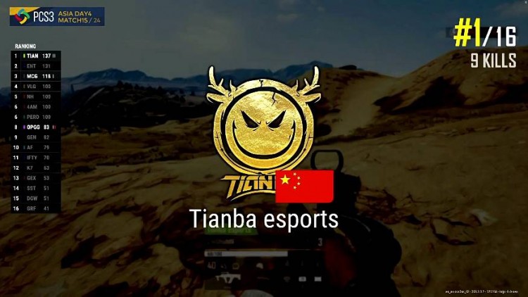 PCS3东亚洲际赛Day4,今日比赛中PeRo在昨日最后一局吃鸡后,今日连吃两把完成三连鸡;Tianba状态恢复重新积分榜第一。