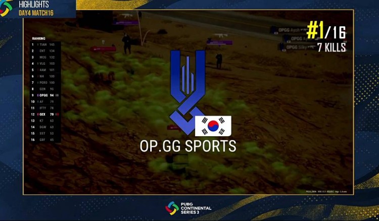八阶段四支队伍,GEX和GenG遭遇,双方互换均损失惨重,GenG止步第四,随后MCG同样被围攻出局。梅花桩阶段OPGG三打三GEX,OPGG远距离连点迅速放倒对手两人,燃烧瓶卡住GEX最后一人位置,成功吃鸡。