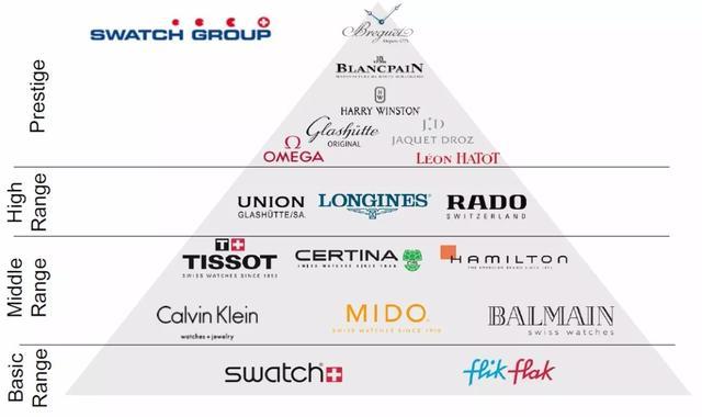 Swatch(斯沃琪)集团先是大量生产和销售时尚、廉价的Swatch石英手表,赚到利润后站稳脚跟,建立了瑞士钟表业的基本盘。然后开展反击,重建自身位置,制定了低端品牌创造利润,高端品牌树立形象,占领市场的计划。随后海耶克开始了“跑马圈地”,天梭、浪琴、欧米茄、宝珀、宝玑等一大批品牌先后都被收购,逐渐建立起了一条覆盖各层次的品牌金字塔。