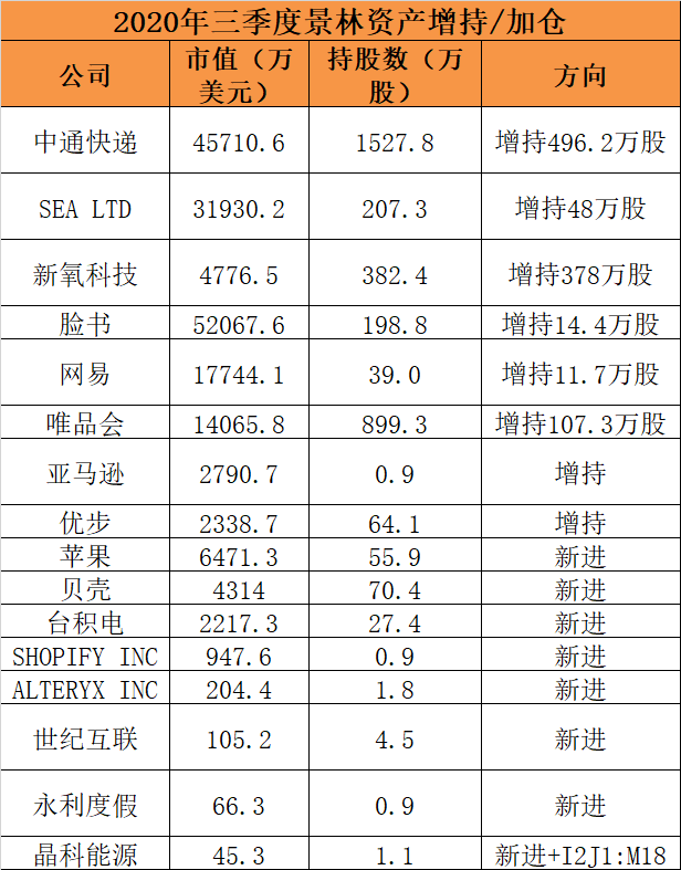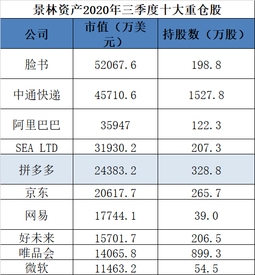 中通快递则颇受景林看好,三季度疯狂加仓近500万股至1528万股,持有市值4.57亿美元(近30亿元人民币),跃升为景林资产在美股第二大重仓股。