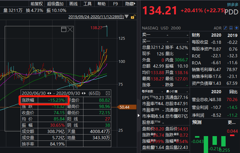 此外,三季度,景林资产减持284.9万股拼多多至328.84万股。但wind数据显示,拼多多三季度震荡下跌15%。但在四季度以来,从最近不到70美元一度暴涨至138美元,股价几近翻倍。