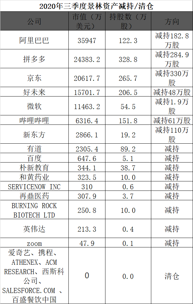 类似的操作也发生在京东身上。景林减持330万股京东至265.66万股,三季度京东涨幅超30%。