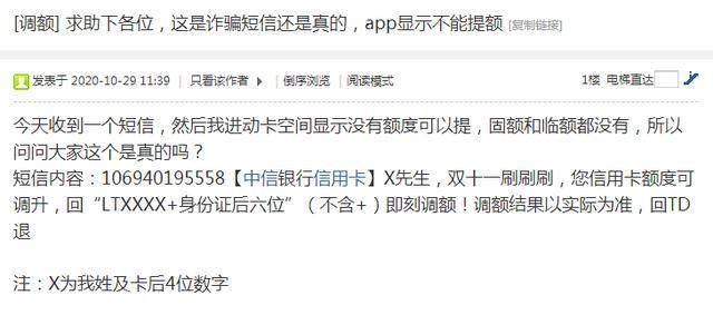 据悉,近期“信用卡提额”的诈骗短信十分泛滥,已有多人中招。关键是在人心惶惶之下,如今网友居然已经不能自辨真假,在收到信用卡提额信息后,上网求助辨别真假,成为了众多网友的重要途径。