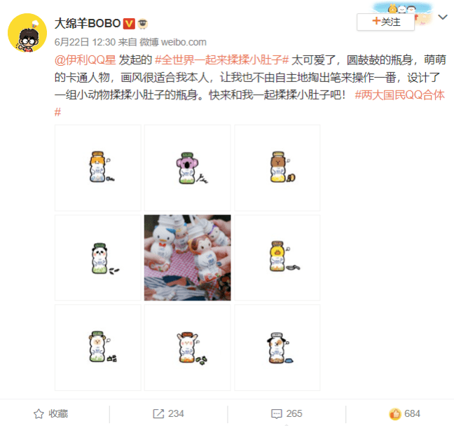 例如在抖音上,头部网红传播的揉肚子舞在平台上迅速传播,将营销主题进行刷屏式发酵;在微博上,大绵羊bobo、喃东尼、郭斯特等头部原创绘画类博主们对瓶身二次创作,也吸引了一大批消费者主动创作,形成专属#全世界一起来揉揉小肚子#的火热话题。