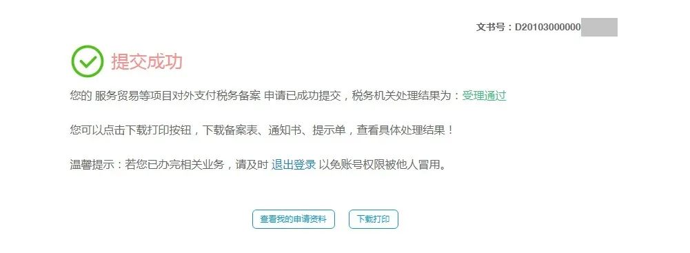 友情提示:优化后的流程新增了《服务贸易等项目对外支付税务备案表》的打印功能。而且《提示单》上的备案编号由之前的13位变为了14位,并新增了验证码。