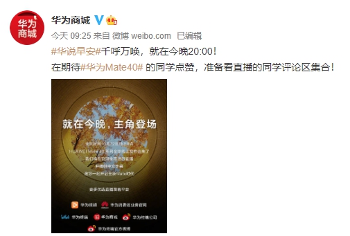 在北京时间今天20点华为年度旗舰新品Mate40系列将正式全球发布,收看发布会直播可以关注华为商城Mate4...